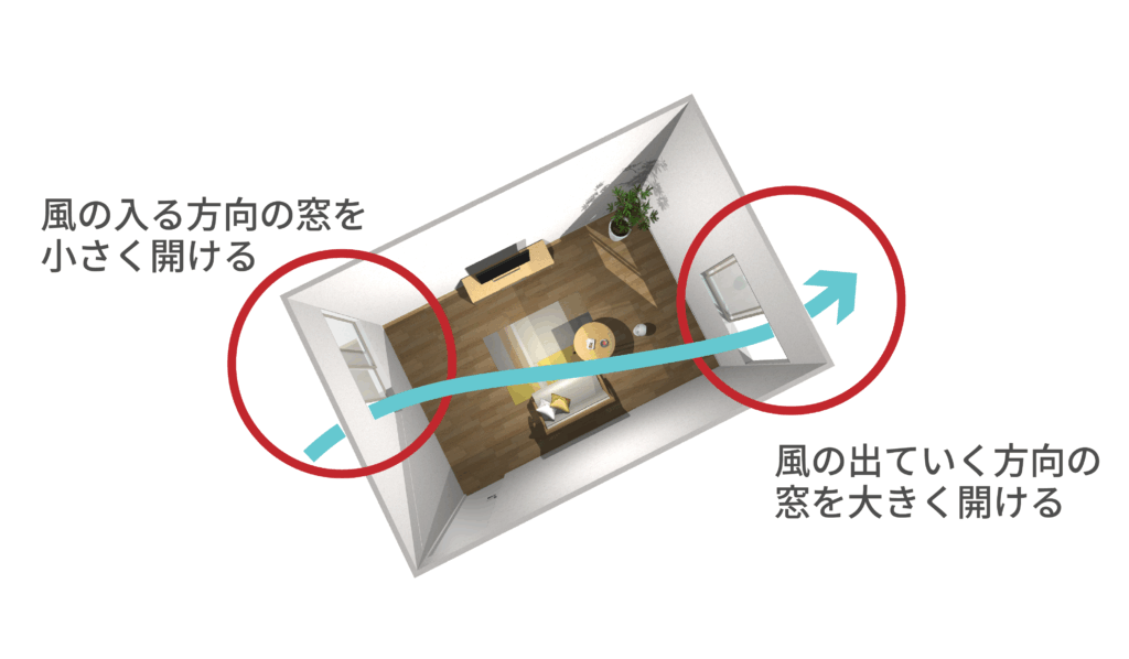1カ所だけ窓を開けても空気はうまく入れ替わりません。対面する2カ所の窓を開けて、風の通り道を作るのが理想的です。