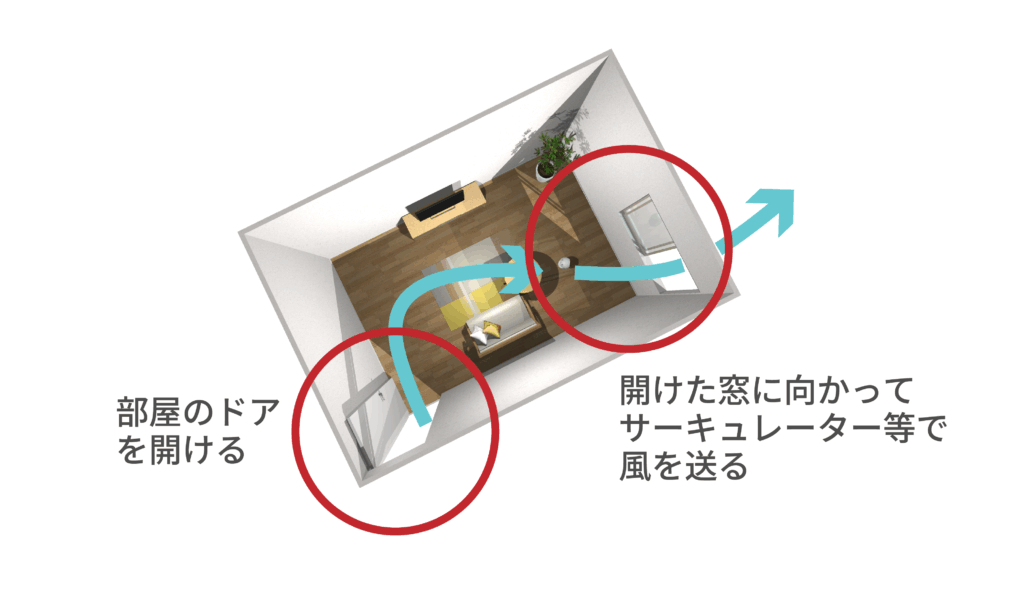 窓が1つしかない場合は、お部屋のドアを開けた上で、窓に向かって扇風機やサーキュレーターで風を送ると、効率よく空気を外に出すことができます。