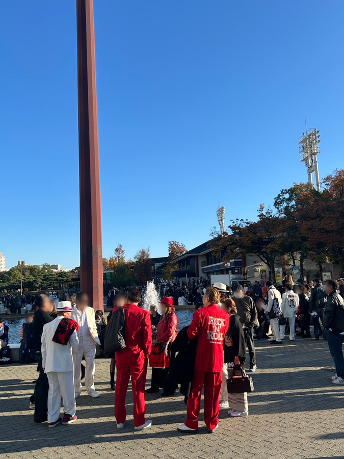 会場前の噴水広場は、開演を待つファンでいっぱい。あちこちに「プチ矢沢」さんがいらっしゃいました。
