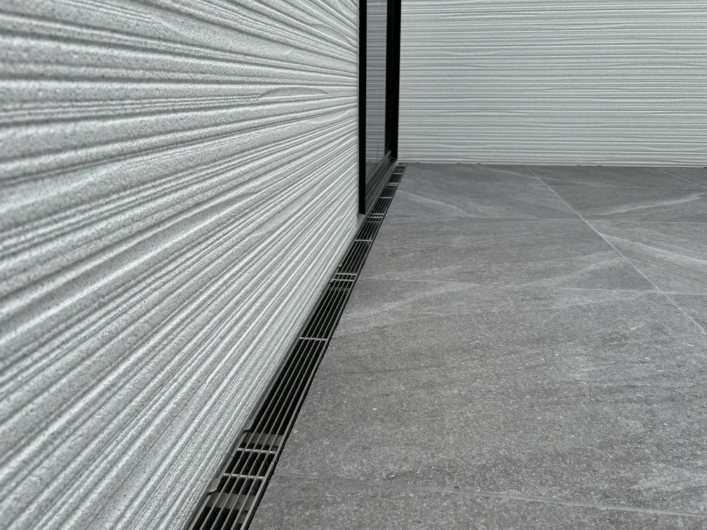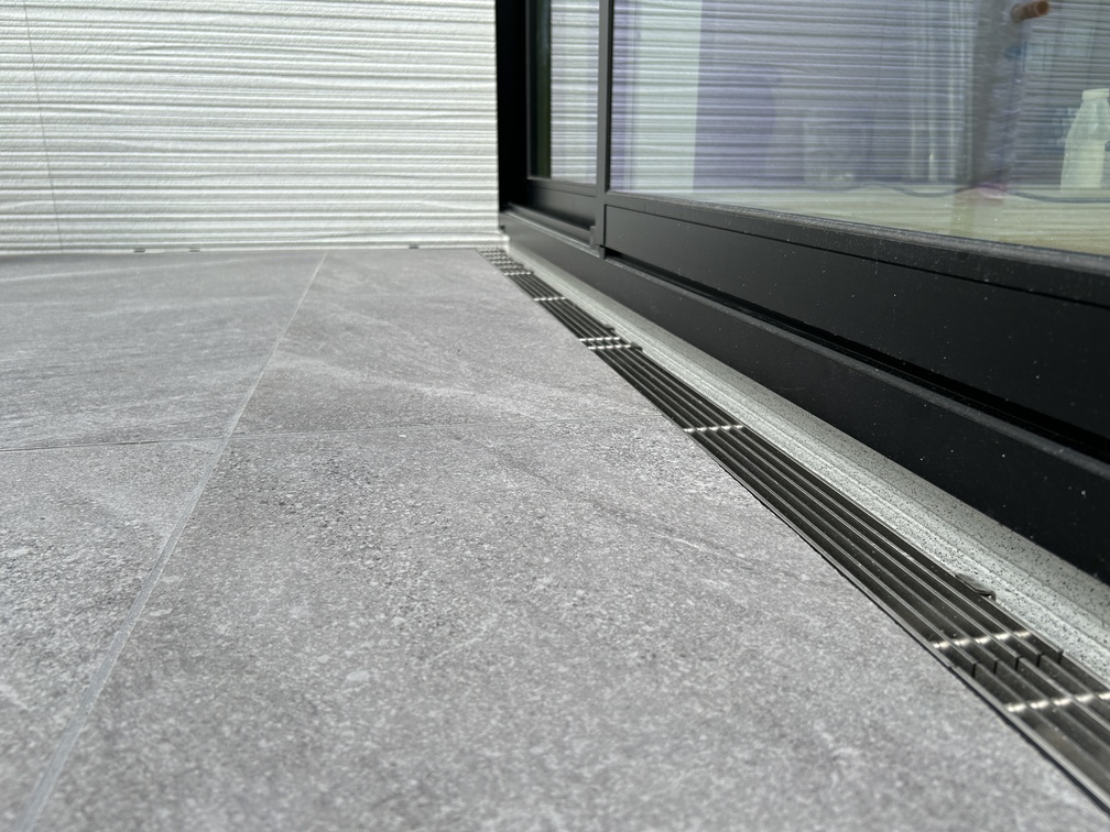 そこで今回は、建物の基礎とタイルデッキの間に隙間を設け、「グレーチング(溝蓋)」を設置する納まりを採用しました。